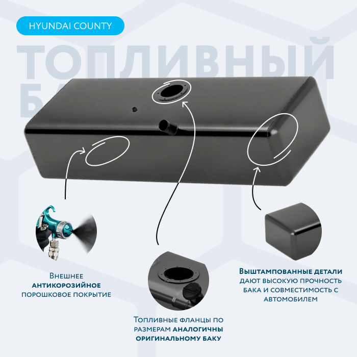 Топливный бак (аналог 1110-5А000 и 31110-5A600) предназначен для установки на автобусы Hyundai COUNTY. Изготовлен из сортовой стали увеличенной толщины 1,5 мм. Резьбовая пластиковая крышка без замка, а также сливная пробка (1/4" коническая, под шестигранник) включены в стоимость бака. Бак изнутри обработан антикором. Снаружи покрашен финской полимерно-порошковой краской. Продукция имеет паспорт и декларацию таможенного союза. Гарантия 1 год.