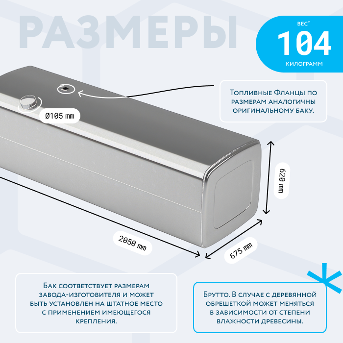 - Так же, если вы приобретаете алюминиевый топливный бак, он будет в деревянной обрешетке (для усиления защиты при транспортировке). При просчете веса и объема, цена за доставку может измениться по факту взвешивания на самом терминале транспортной компании. Так как деревянная обрешетка соответственно изготовлена из древесины, и она имеет свойство значительно набирать вес в зависимости от влажности окружающей среды.